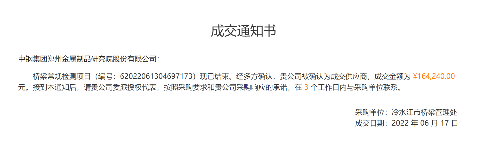 摘要:中鋼集團(tuán)鄭州金屬制品硏究院股份有限公司中標(biāo)湖南冷水市橋梁常規(guī)檢測項目